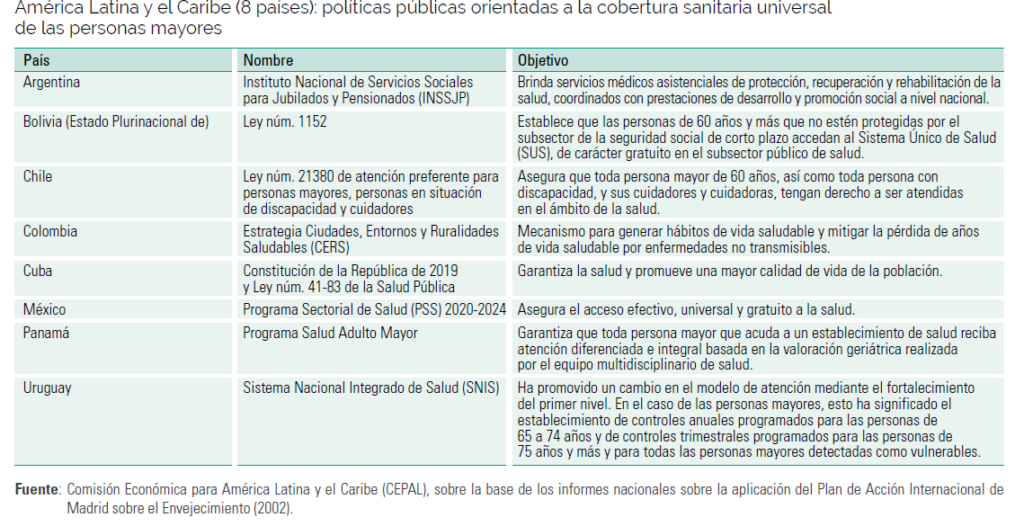 Algunos países han elevado la salud de las personas mayores al rango de política, plan o programa nacional, como es el caso de Bolivia (Estado Plurinacional de) (Plan de Acción Quinquenal hacia el Envejecimiento Activo y Saludable), en Brasil (Política Nacional de Salud de la Persona Mayor), Chile (Plan Nacional de Salud Integral para las Personas Mayores) y Cuba (Programa Nacional de Atención Integral al Adulto Mayor).